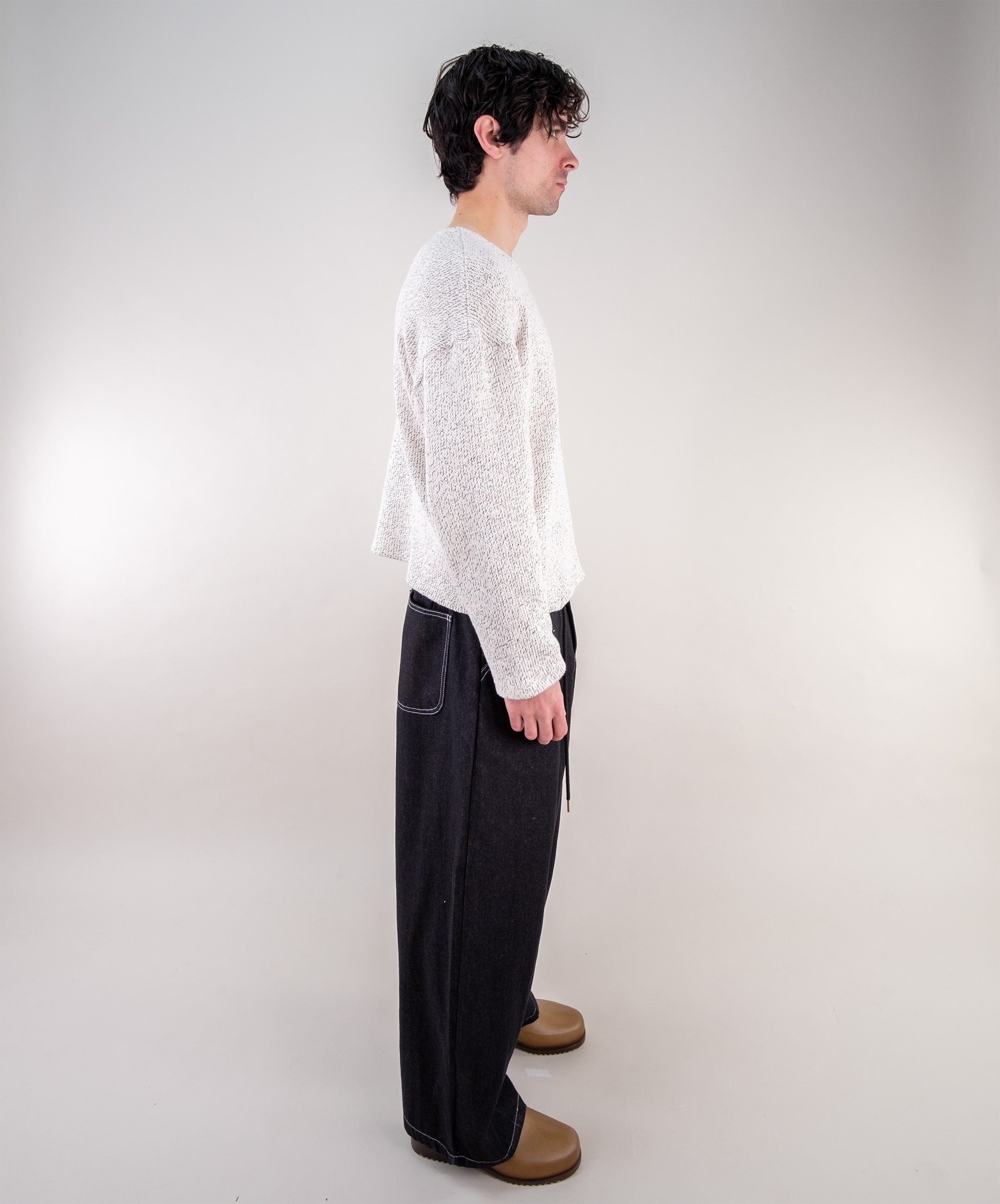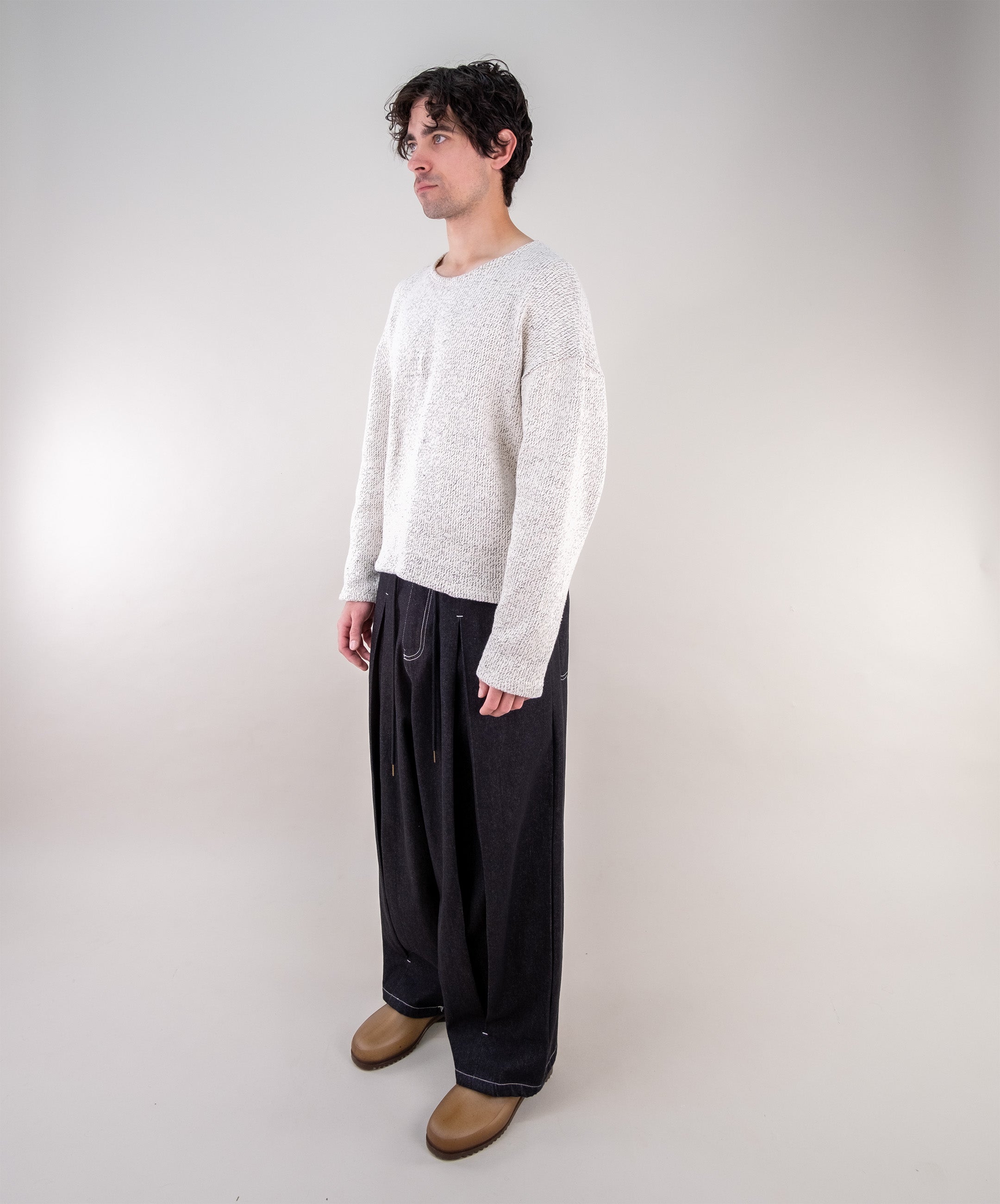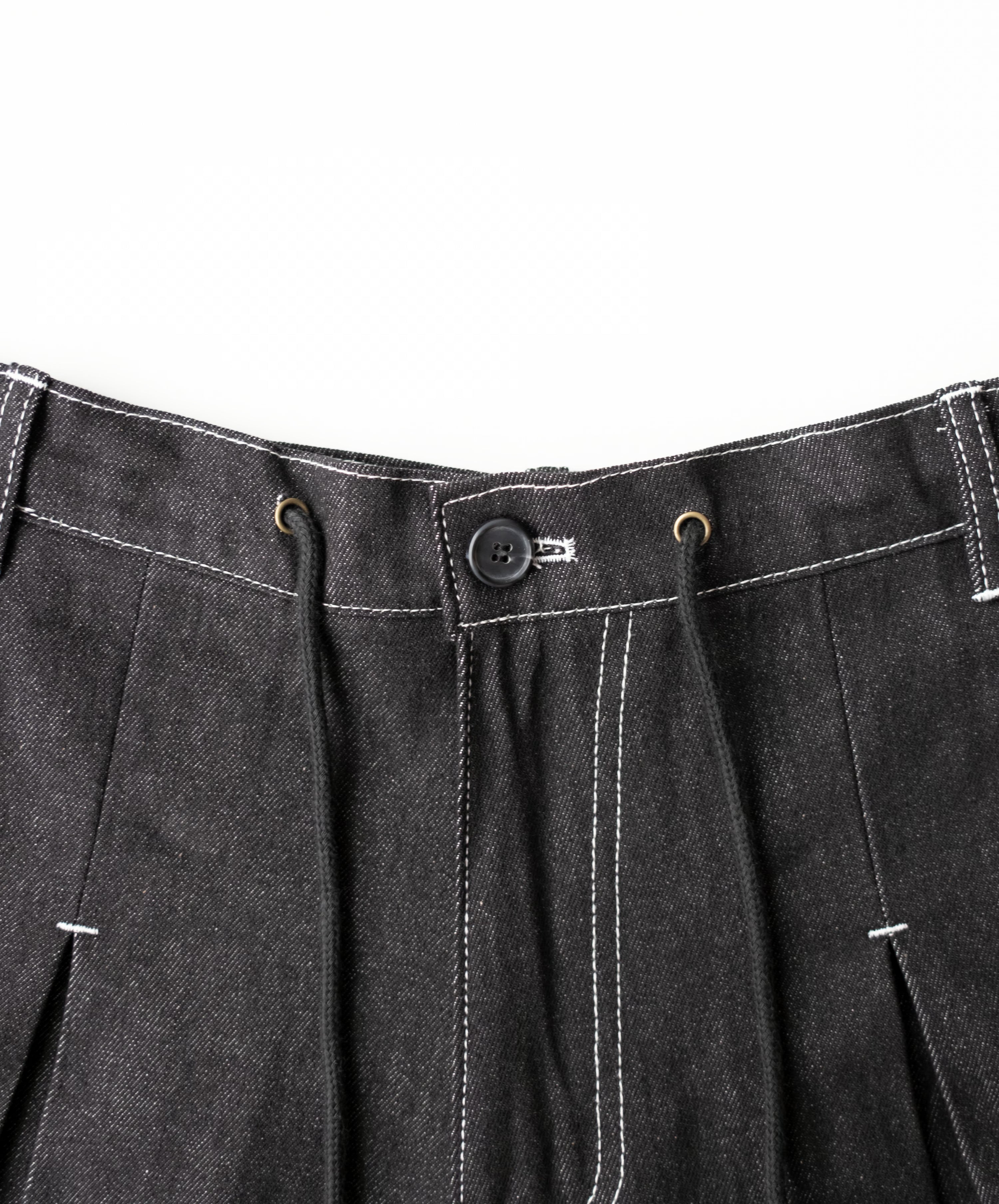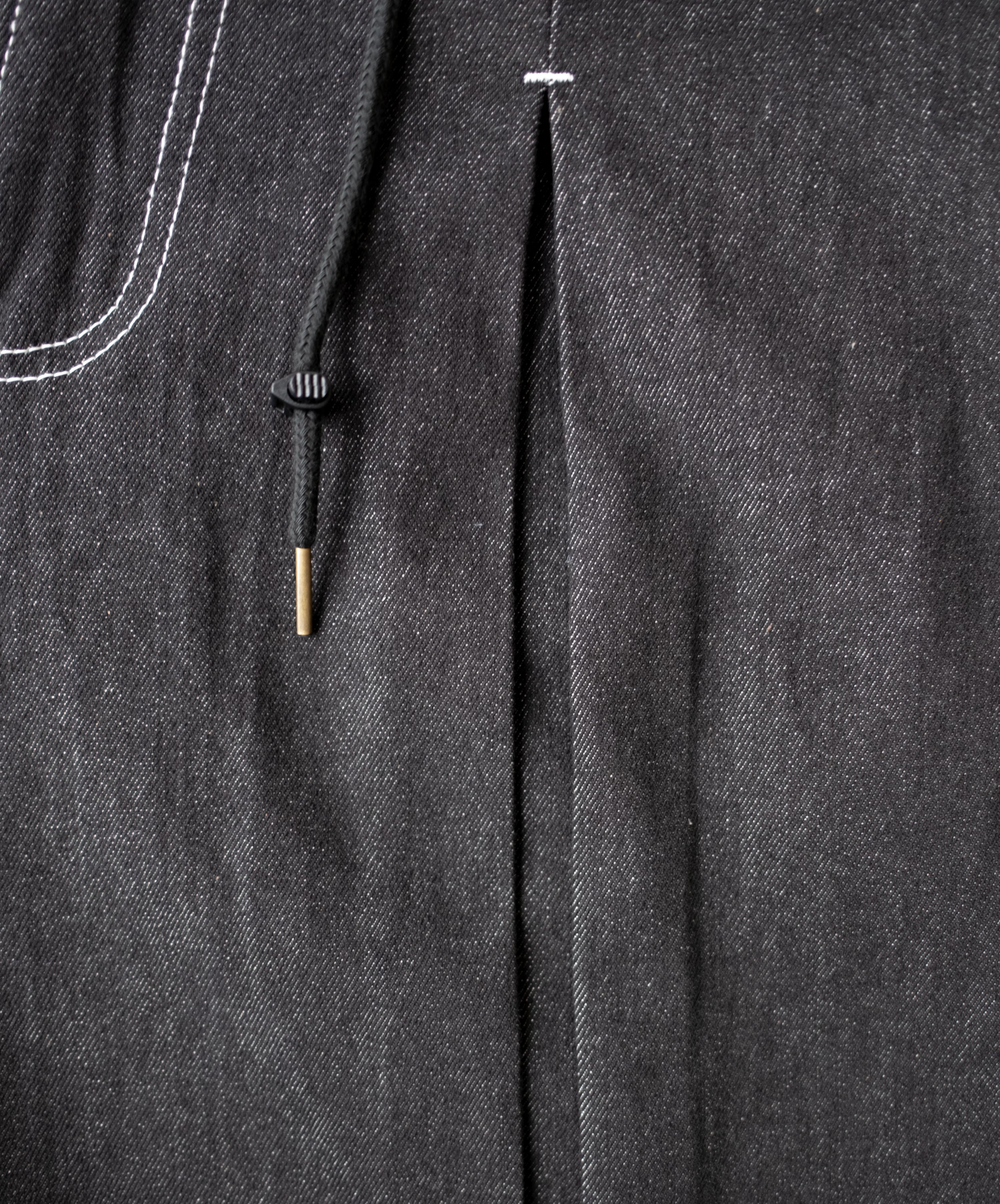 The denim box pleat jeans feature box pleat details that give them structure and volume. They also include drawstrings with stoppers at the waist for an adjustable fit.